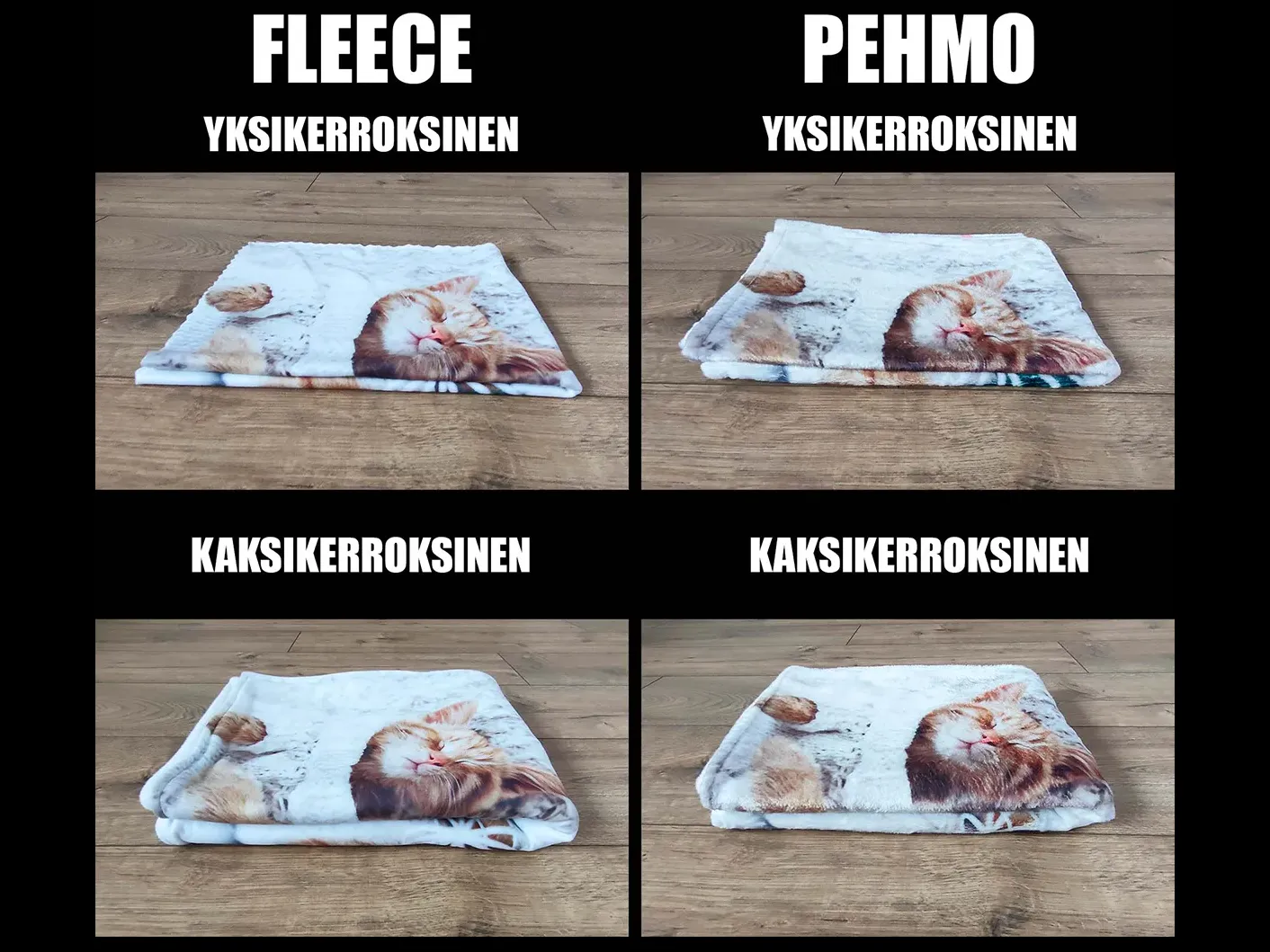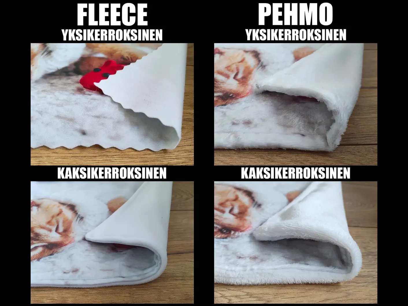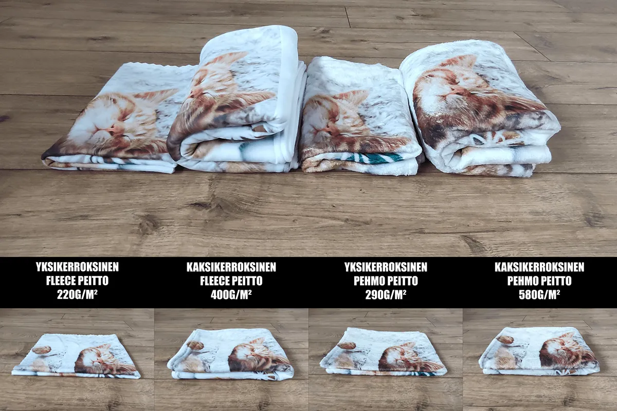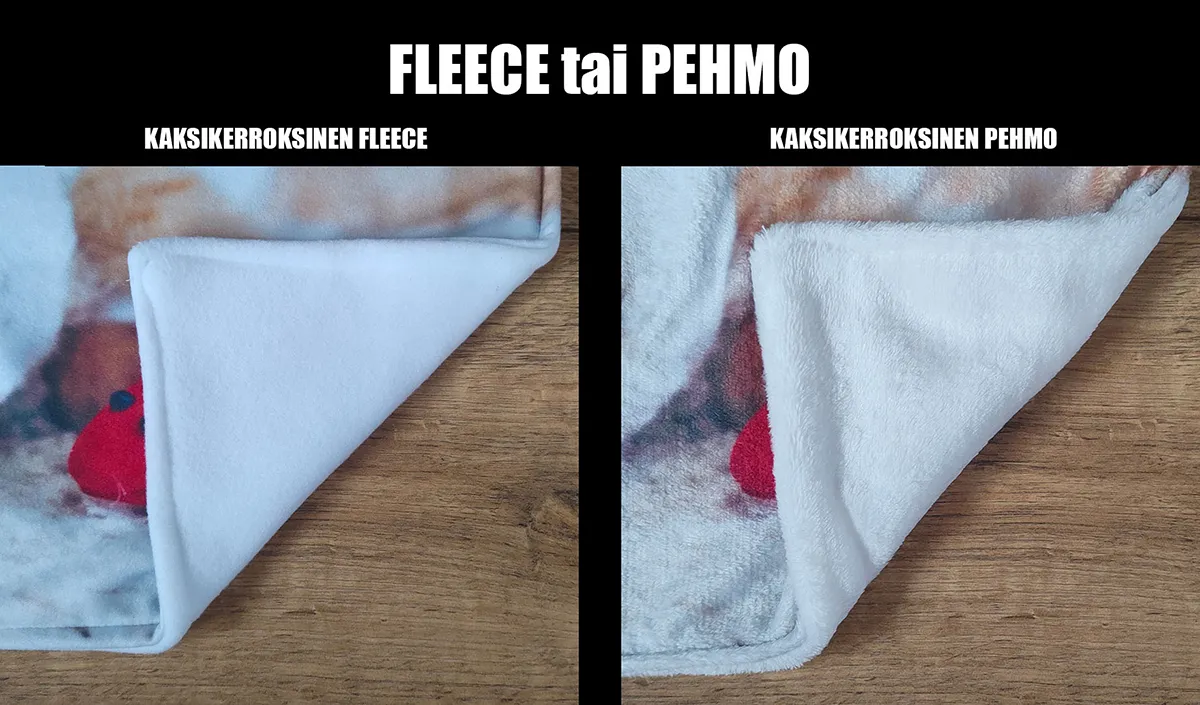 Yksi asiakkaidemme yleisimmistä kysymyksistä on, mikä ero on fleece- ja plyysikankaalla. Vaikka molemmat materiaalit ovat pehmeitä ja lämpimiä, niiden rakenne ja kuitujen pituus eroavat toisistaan, mikä vaikuttaa niiden tuntumaan ja ulkonäköön. Molemmat kankaat sopivat erinomaisesti painettuihin huopiin, mutta niillä on omat ainutlaatuiset ominaisuutensa.