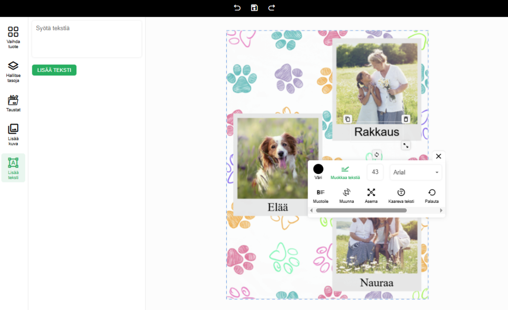 Jokaiseen malliin voit lisätä omia kuviasi ja tekstiä, jolloin luot juuri sellaisen designin, josta haaveilet!